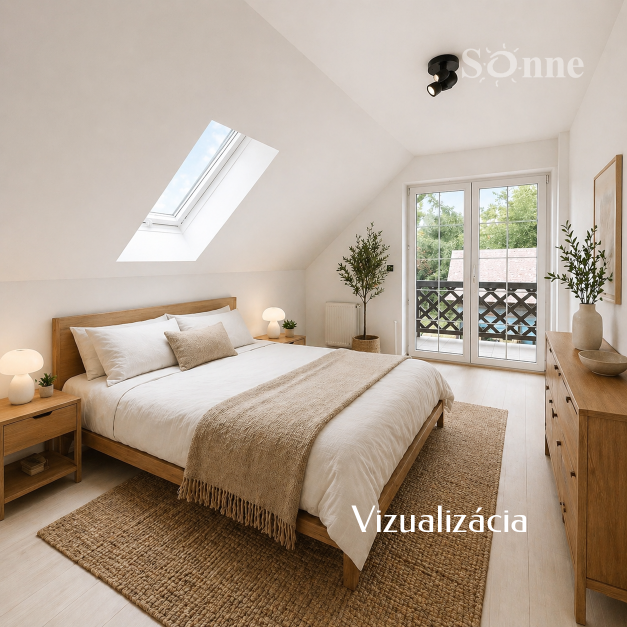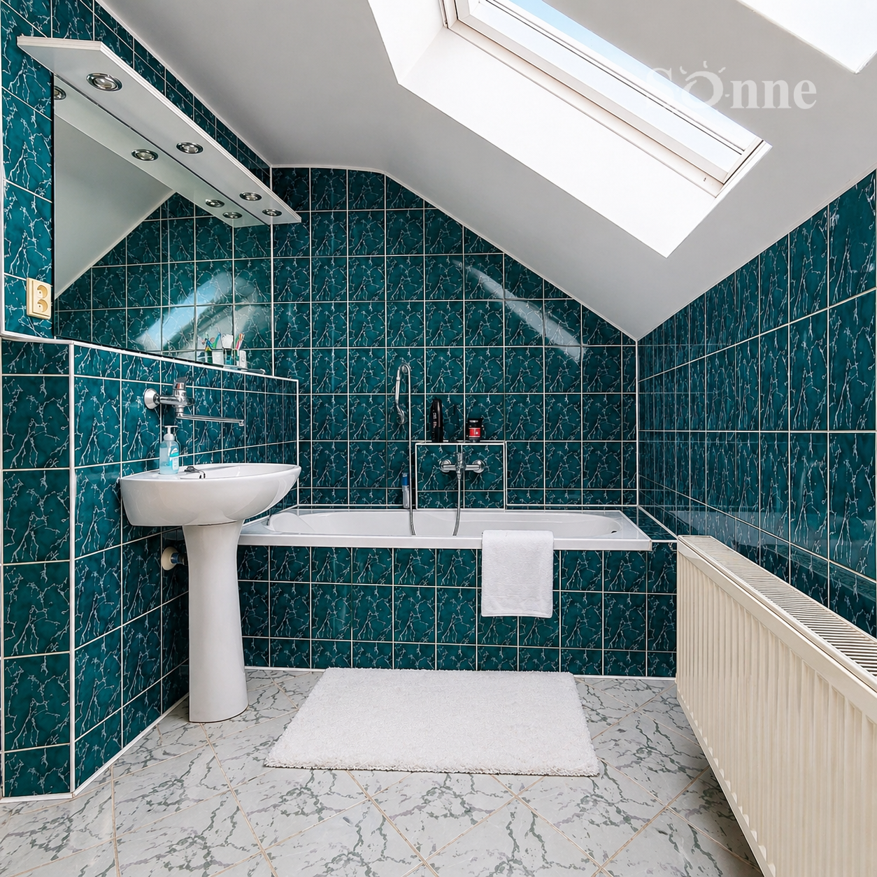 Kúpeľňa je presvetlená dvoma strešnými oknami, vďaka čomu pôsobí vzdušne a príjemne.
